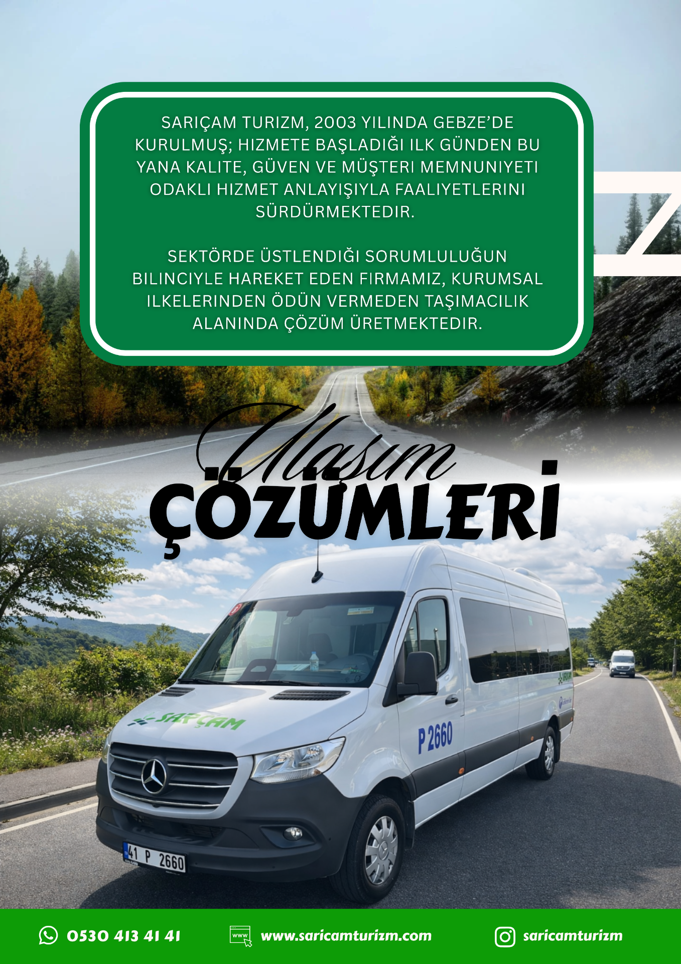 Sarıçam Turizm, 2003 yılında Gebze'de kurulmuş; hizmete başladığı ilk günden bu yana kalite, güven ve müşteri memnuniyeti odaklı hizmet anlayışıyla faaliyetlerini sürdürmektedir. Sektörde üstlendiği sorumluluğun bilinciyle hareket eden firmamız, kurumsal ilkelerinden ödün vermeden taşımacılık alanında çözüm üretmektedir.